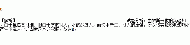 如图所示,帕斯卡曾经用一个装满水的密闭木桶,在桶盖上插了一根细长的管子,向细管子里灌水,结果只加了几杯水,就把木桶压裂了,这个实验说明了