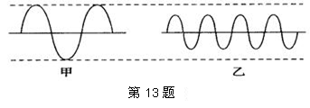 试题分析:甲的振幅大响度大,乙的波形密集,所以频率大,音调高。