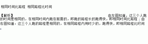 在日常生活中,我们常用两种方法来比较物体运动的快慢。如图是在校运动会上,某同学观察百米赛跑,借助于这两个图来说明这两种方法。左图表明:_______________;右图表明:____________________。