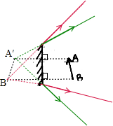 (2)分别连接像点A′与像点B′与平面镜的最上边缘和最下边缘,并延长,则上面的绿色箭头和下面的红色箭头的区域能观察到这个物体经平面镜所成的完整的像.