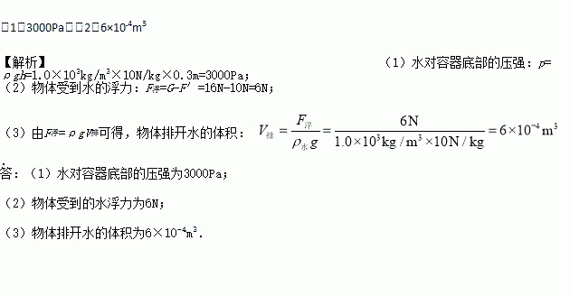 如图所示,弹簧测力计下面悬挂一个重16N的物体,当把物体浸没在水中时,弹簧测力计示数为10N,此时容器内水的深度为0.3m(ρ水=1.0×103kg/m3,g=10N/kg),求: