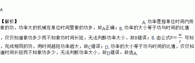 A 【解析】A. 功率是指单位时间内所做的功,功率大的机械在单位时间里做的功多,故A正确;B. 功率的大小等于功与时间的比值,仅仅知道做功多少而不知做功时间长短,无法判断功率大小,故B错误;B. 由公式P=可知,完成相同的功,用时间越短功率越大,故C错误;D. 功率的大小等于功与时间的比值,仅仅知道时间长短而不知做功多少,无法判断功率大小,故D错误。故选A.