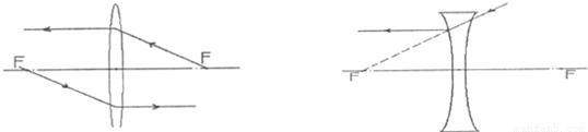 【答案】分析:根据透镜的特殊光线作图:平行于主光轴的光线经凸透镜折射后将过焦点;过焦点的光线经凸透镜折射后,平行于主光轴;过光心的光线传播方向不变;平行于主光轴的光线经凹透镜折射后的光线的反向延长线过焦点;射向焦点的光线经凹透镜折射后,将平行于主光轴.