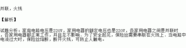 并联,火线 【解析】 试题分析:家庭电路电压是220V,家用电器的额定电压也是220V,各家用电器之间是并联时,各家用电器都正常工作,并且互不影响.为了安全起见,保险丝需要串联在火线上.当电路中电流过大时,保险丝熔断,断开火线,可防止人触电。