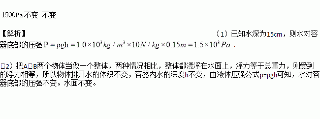在装有适量水的容器中放入一木块A,木块上方叠放一铁块B,静止时如图甲所示,水深为15cm,则水对容器底部的压强为________Pa(g=10N/kg);当把铁块B拴在木块A下方,放在水中静止时如图乙所示,则水对容器底部压强_____ (选填“变大”、“变小”或“不变”).水面________(选填“上升”、“下降”或“不变”).