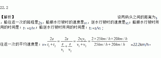 22.2 【解析】设两码头之间的距离为s,船往返一次的路程是2s,船顺水行驶时的速度是v1,逆水行驶时的速度是v2;船顺水行驶时所用的时间是:t1 =s/v1;船逆水行驶时所用的时间是:t2 =s/v2; 往返一次的平均速度是:v= ≈22.2km/h。