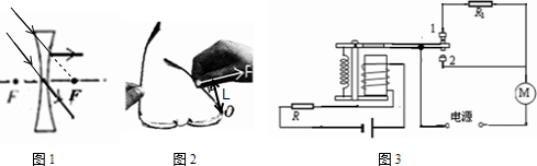 (3)小明去超市,走到电梯前发现电梯运动较慢,当他站在电梯上时又快了起来.小明根据所学的知识,画出如图3所示的部分电路(R是一个压敏电阻).小明分析:当人站在电梯上,压敏电阻的阻值减小,则电磁铁的磁性变强,衔铁与触点2接触,电动机的转速变快.你帮小明完成剩余部分的电路连接并标明电磁铁(左边电路中)上端的磁极.