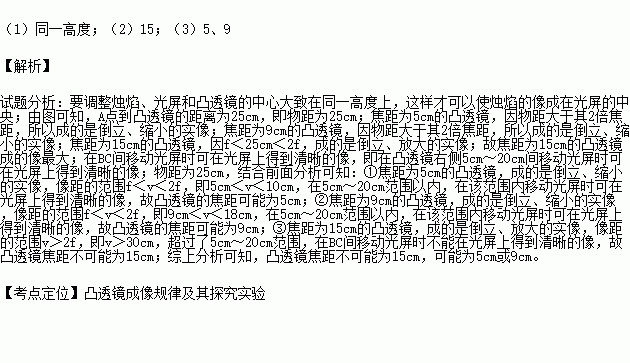 在焦距为5cm、9cm和15cm的凸透镜中选择一个放置在如图所示的位置,将蜡烛、光屏分别置于光具座上透镜两侧,调整透镜和光屏的中心大致与烛焰的中心在 ;若将蜡烛放置在A点通过三个凸透镜都能在光屏上成像,则焦距为 cm的透镜所称的像最大,若在BC间移动光屏时可在光屏上得到清晰的像,则实验中所用透镜的焦距可能是 cm.