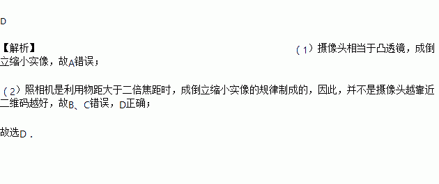 A. 摄像头相当于凹透镜 B. 摄像头越靠近二维码越好