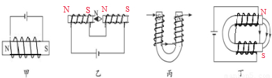 丁图,电流从正极出,电流从上边螺线管右端流入,而上边通电螺线管右端为N极;从下边螺线管左端流入,而下边通电螺线管左端为N极;根据安培定则得出螺线管的绕法,如图所示: