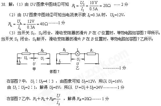 如图甲所示,电源两端的电压恒定。当开关S1、S2闭合,滑动变阻器的滑片P在C位置时,电压表V1的示数为U1;电压表V2的示数为U2;当开关S1闭合,S2断开,滑动变阻器的滑片P在B位置时,电压表V3的示数为U3,电流表示数为0.3A。图27乙中图线①反映的是定值电阻R1两端电压与通过其电流关系;图线②反映的是小灯泡L两端的电压与通过它的电流的关系。已知:U1∶U2=2∶1,U1∶U3=4∶3。求:
