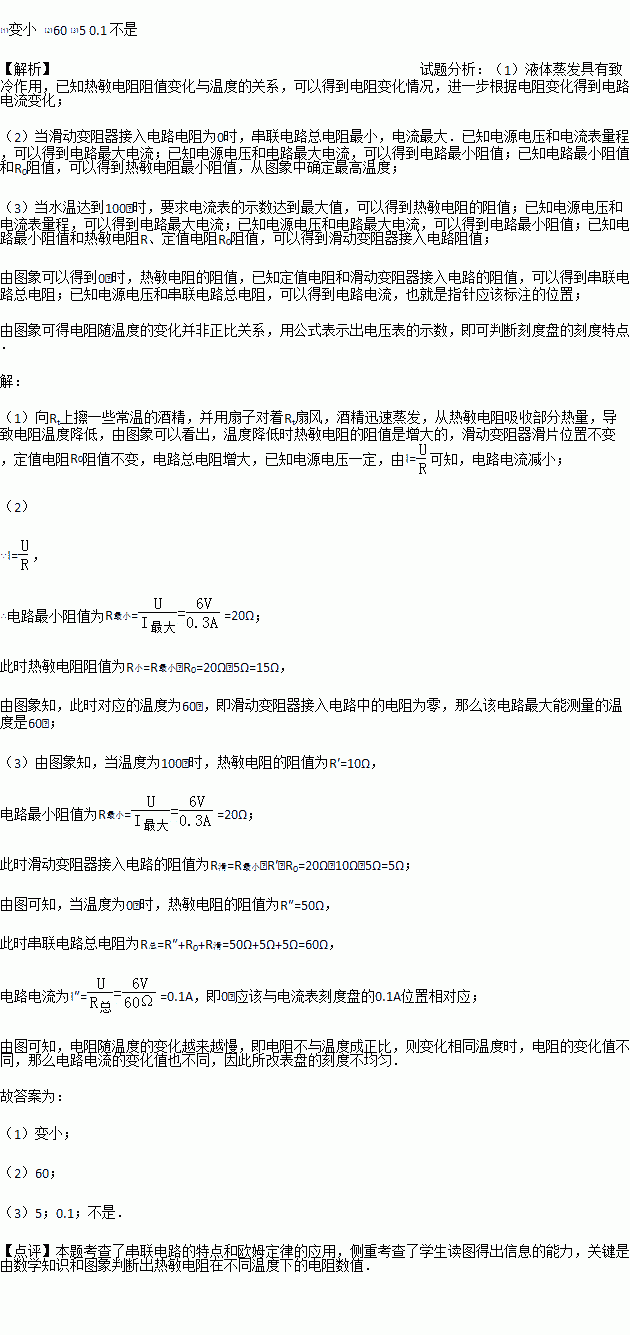 £¨3£©ÎªÁËÄܲâÁ¿0¡«100¡æµÄˮΣ¬ÇÒµ±Ë®Î´ﵽ100¡æÊ±£¬ÒªÇóµçÁ÷±íµÄʾÊý´ïµ½×î´óÖµ£¬Ôò»¬¶¯±ä×èÆ÷½ÓÈëµç·Öеĵç×èÓ¦µ÷Ϊ____¦¸£¬0¡æÓ¦¸ÃÓëµçÁ÷±í¿Ì¶ÈÅ̵Ä_________AλÖöÔÓ¦£¬Èç¹ûµçÁ÷±í¿Ì¶ÈÅ̸ĻΪָʾζȵĿ̶ȣ¬ÇÒÿ10¡æ»Ò»Ìõ¿Ì¶ÈÏߣ¬Õâ¸ö¿Ì¶ÈÅ̵Ŀ̶È________£¨Ñ¡Ìî¡°ÊÇ¡±»ò¡°²»ÊÇ¡±£©¾ùÔȵġ£