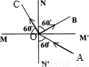 解答:解:由图知,∠NOB=60°,所以∠AON′=60°.根据反射角等于入射角,所以MM′为法线,NN′为界面.则OA一定为入射光线,OB为反射光线,OC为折射光线.然后标上箭头,如图所示: