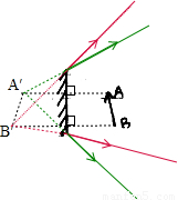 (2)分别连接像点A′与像点B′与平面镜的最上边缘和最下边缘,并延长,则上面的绿色箭头和下面的红色箭头的区域能观察到这个物体经平面镜所成的完整的像.