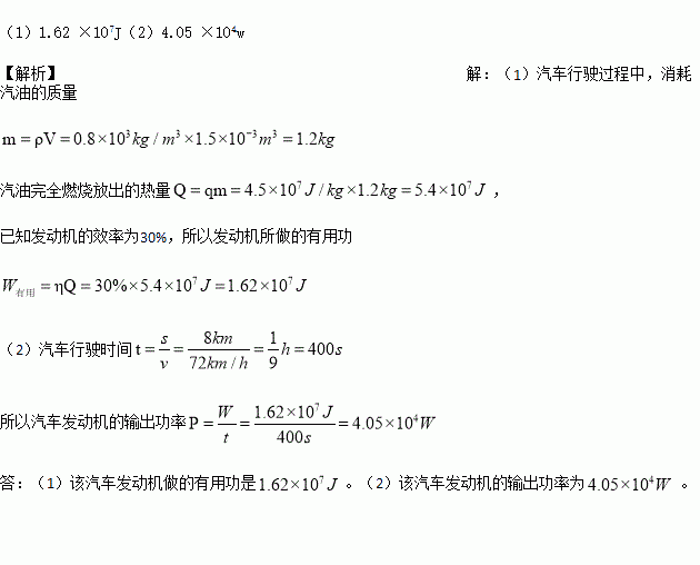 ÈçͼËùʾ£¬ÊÇ×îÐÂÒ»¿îÎÞÈ˼ÝÊ»Æû³µÔÐÍͼ¡£Æû³µ×Ô¶¯¼ÝʻʱʹÓÃÀ×´ï´«¸ÐÆ÷£¬ÒÔ¼°¼¤¹â²â¾àÆ÷À´Á˽âÖÜΧµÄ½»Í¨×´¿ö¡£¸Ã¿î³µÒÔ72km/hµÄËÙ¶ÈÔÚÒ»¶ÎƽֱµÄ¹«Â·ÉÏÔÈËÙÐÐÊ»ÁË8kmʱ£¬ÏûºÄÆûÓÍ1.5L¡£¼ÙÉèȼÓÍÍêȫȼÉÕ£¬·¢¶¯»úµÄЧÂÊΪ30%£¬ÄÇô£¬ÔÚÕâ¶ÎÔ˶¯¹ý³ÌÖУ¬£¨ÒÑÖª£ºÆûÓ͵ÄÃܶȦÑ=0.8¡Á103kg/m3£¬ÆûÓ͵ÄÈÈÖµq=4.5¡Á107J/kg£©Çó£º