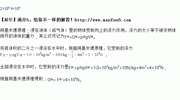 一个物体的体积为4m3, 将其体积的二分之一浸在水中时,它受到的浮力是________N;全部浸在水中时,被排开的水所受的重力是________N.
