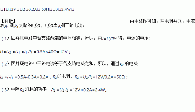 在如图所示的电路中,电源电压保持不变,电阻R1的阻值为40Ω,闭合开关S,电流表A1的示数为0.3A,电流表A的示数为0.5A.求: