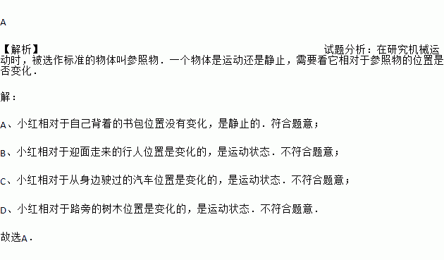 A 【解析】试题分析:在研究机械运动时,被选作标准的物体叫参照物.一个物体是运动还是静止,需要看它相对于参照物的位置是否变化. 【解析】 A、小红相对于自己背着的书包位置没有变化,是静止的.符合题意; B、小红相对于迎面走来的行人位置是变化的,是运动状态.不符合题意; C、小红相对于从身边驶过的汽车位置是变化的,是运动状态.不符合题意; D、小红相对于路旁的树木...