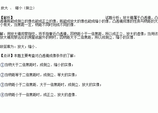 用放大镜观察指纹,可以看到指纹被 ,然后用放大镜观察窗外的树,可以看到树的 像.