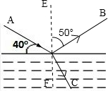 解:过入射点O做法线EF,从而确定了入射光线位于法线的左侧,并同时确定了入射角的大小:入射光线AO与界面的夹角为40,则入射角为50,所以反射角也为50.根据光的反射规律可作出对应的反射光线OB;