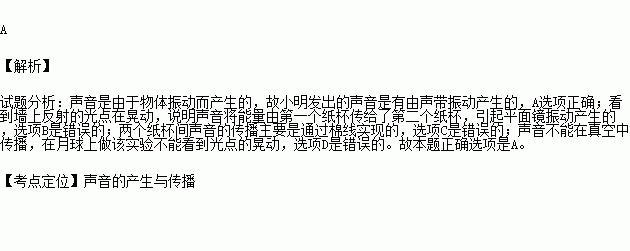 ÈçͼËùʾ£¬ÊÇСÃ÷̽¾¿¡°¿´¡±µ½×Ô¼ºµÄÉùÒôµÄʵÑé¡£°ÑÁ½¸öÖ½±µ×²¿ÓÃϸÃÞÏßÁ¬½ÓÆðÀ´£¬¹Ì¶¨ÆäÖÐÒ»¸öÖ½±£¬ÔÚÖ½±¿ÚÉÏÃÉÉϽºÄ¤£¬Ä¤ÉÏÕ³Ò»Æ¬Ð¡Æ½Ãæ¾µ£¬À½ôÃÞÏߣ¬½«¼¤¹â±Ê·¢³öµÄ¹âÕÕÉäÔÚÆ½Ãæ¾µÉÏ£¬Ð¡Ã÷¶ÔÁíÒ»Ö½±Ëµ»°£¨²»½Ó´¥Ö½±£©£¬»á¿´µ½Ç½ÉÏ·´ÉäµÄ¹âµãÔڻζ¯¡£ÔòÏÂÁÐ˵·¨ÕýÈ·µÄÊÇ