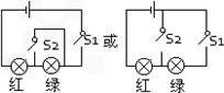 将图中的元件连成电路,要求:元件位置不能移动,只合上S1时,红灯、绿灯都亮;合上S1、S2时,红灯亮,绿灯不亮。