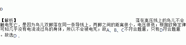 D 【解析】落在高压线上的鸟儿不会触电死亡,是因为鸟儿双脚落在同一条导线上,两脚之间的距离很小,电压很低;根据欧姆定律可知几乎没有电流流过鸟的身体,所以不会被电死;故A、B、C不符合题意,只有D符合题意。故选D.