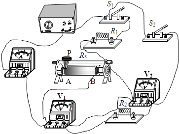 如图所示,闭合S1滑片P至于中点C,V1的示数为U,R1的功率为P1,电流表的示数是I=0.8A.若只闭合S2,P置于A端,V1的示数为U′,U′=U,将滑片P置于B端,S1、S2都闭合,V2的示数为U″,U″=3U,R2的功率P2=9W,求:(1)只闭合S2时,电流表的示数;