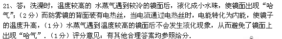 在家里洗澡时,浴室里的镜子上常常会出现“哈气”,用起来十分不方便.现在有一种新型的镜子——防雾镜,就是在普通镜子的背面装有电热丝,洗澡时,只要接通其电路,就可避免镜子上出现“哈气”.请你说明“哈气”产生的原因,以及防雾镜是怎样避免