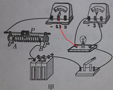 (5)小亮同学移动滑动变阻器滑片P到某处时,电压表的示数为2.2V,要测量小灯泡的额定功率是,应将滑片P向 端移动(选填“A”或“B" )。当小灯泡正常发光时,电流表示数如图乙所示,则小灯泡的额定功率是 W,此时小灯泡的电阻是 Ω。该实验中滑动变阻器除了保护电路外,还有 的作用。![]()
