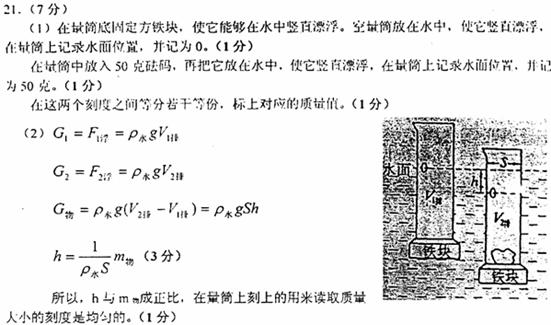 实验室里常用量筒来测物体的体积。某同学想把量筒改装成既可直接测量体积,又可直接测量物体质量的装置,并且用来读取质量大小的刻度也是均匀的。供选择器材如下:量筒一只;大小形状适中的方铁块、木块、泡蘑塑料各一块;50克砝码一只,可把物品固定在玻璃上的用具;可在玻璃上写字的笔;足量的水和盛水的容器。