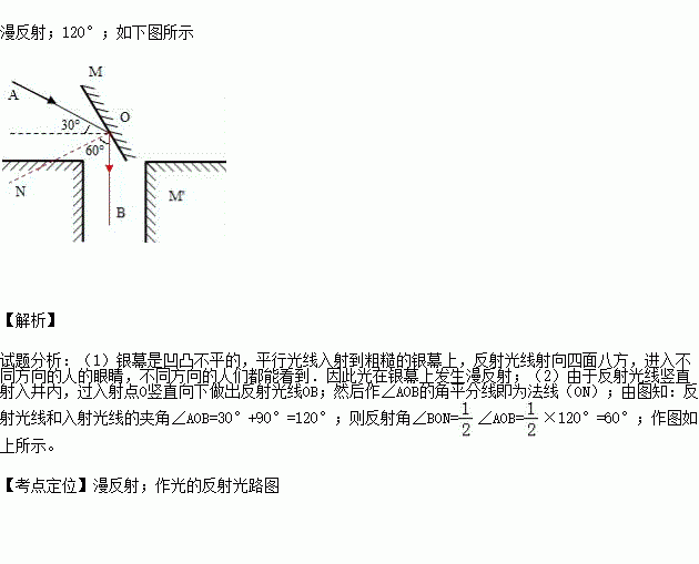 由于光在电影屏幕上发生 ,所以人们能从不同方向看到屏幕上的像.小明想用一块平面镜使水平面成30°角的太阳光竖直射入井中(如图所示),则反射光线与入射光线的夹角为 ,在图中画出平面镜的位置并标出镜面与水平面夹角的度数.