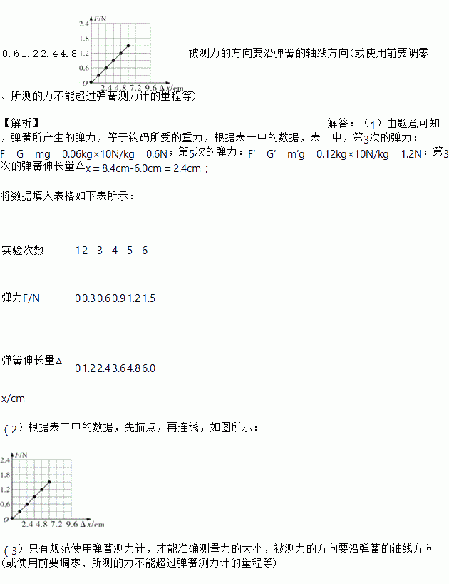 0.6 1.2 2.4 4.8 被测力的方向要沿弹簧的轴线方向(或使用前要调零、所测的力不能超过弹簧测力计的量程等) 【解析】解答:(1)由题意可知,弹簧所产生的弹力,等于钩码所受的重力,根据表一中的数据,表二中,第3次的弹力:F=G=mg=0.06kg×10N/kg=0.6N;第5次的弹力:F′=G′=m′g=0.12kg×10N/kg=1.2N;第3次的弹簧伸长量△x=8.4cm-6.0...