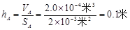 ①mA=ρ水VA=1.0×103千克/米3×2.0×10-4米3=0.2千克 2分