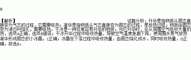利用干冰(固态二氧化碳)进行人工降雨的主要过程是:干冰在高空中直接变成气体,高空中的水蒸气遇冷直接变成冰晶,冰晶下落时变成雨.以下分析错误的是( )