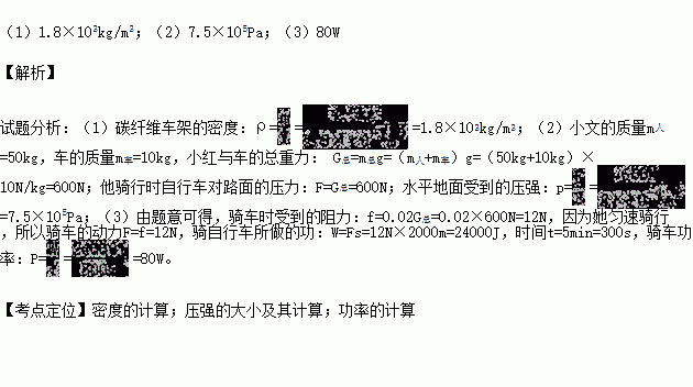 小文骑自行车上学,他在水平路面上5min匀速骑行了2000m,已知小文的质量为50kg,骑行时轮胎与地面的接触面积为8cm2,阻力大小是重力的0.02倍,g=10N/kg.表格中是他的自行车的一些数据,根据以上条件计算: