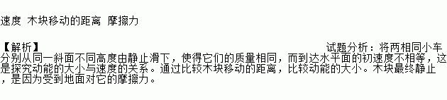 如图,两相同小车分别从同一斜面不同高度由静止滑下,撞击水平面上的木块,该实验是探究动能与 的关系,通过比较 比较动能大小,木块因受到 最终静止。