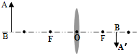 解:由图可见物体AB到凸透镜光心的距离大于2倍焦距,因此物体AB的像位于1倍焦距和2倍焦距之间,成倒立、缩小的实像,如下图所示: