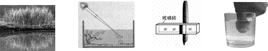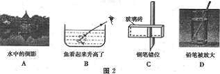 A.水中倒影 B.鱼看起来升高了 C.钢笔错位 D.手被放大
