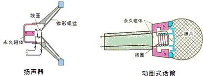 ②动圈式话筒是把声信号转换成电信号的一种装置.它主要由膜片、与膜片相连的线圈和永久磁体构成.声波引起膜片振动,线圈和膜片是连在一起的,连在膜片上的线圈就一起振动,线圈在永久磁体的磁场里振动,切割磁感线产生感应电流,这就是电信号.线圈振动的快慢、强弱代表了声音振动的特征,产生感应电流的大小和方向就随着这个特征而变化,这个记载声音信号的感应电流经放大后传给扬声器,就发出声音.