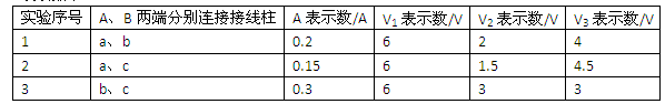 图1所示电路,电源电压恒定,A、B两端接电阻.图2为一个暗盒,盒中装有由两个电阻和导线组成的路,盒外a、b、c是该电路的三个接线柱.某同学把接线柱a、b;a、c;b、c分别连接到图2电路的A、B两端进行实验,测得各电表的示数如表1所示.