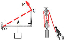 在杠杆上的A点挂一重物。在C点对杠杆施加一个最小的力,使杠杆平衡在甲图中所示的位置,试画出这个力的示意图和力臂.如乙图所示,某人使用滑轮组提升重物,请你在答题卡上画出他使用滑轮组最省力的绕法。