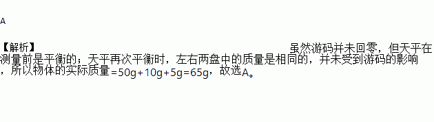小虎同学用托盘天平测物体的质量,在调节天平平衡时,忘记了移动游码(游码位于0.2g的位置),测量时,物体放在左盘,在右盘放入50g、10g、5g的砝码各一个,指针恰好指在分度盘的中央,则被测物体的质量为 ( )