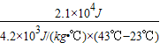 解答:解:补充条件:水吸收了2.1×104J的热量,其温度由23℃升高到43℃,求水的质量是多少?
