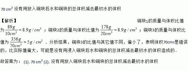 70 cm3 ûÓÐÓ÷ÅÈëÍ¿éºóË®ºÍÍ¿éµÄ×ÜÌå»ý¼õÈ¥×î³õË®µÄÌå»ý ¡¾½âÎö¡¿Í¿é1µÄÖÊÁ¿ÓëÌå»ý±ÈֵΪ£»Í¿é2µÄÖÊÁ¿ÓëÌå»ý±ÈֵΪ£»Í¿é3µÄÖÊÁ¿ÓëÌå»ý±ÈֵΪ£®·ÖÎö½á¹û£¬Í¿é3µÄ±ÈÖµÓëÆäËüÖµ²»Í¬£¬Æ«Ð¡ÁË£¬±íÃ÷Ìå»ý70cm3ÊÇ´íÎóµÄ£¬±Èʵ¼Êֵƫ´ó£¬¿ÉÄÜÊÇûÓÐÓýþÈëÍ¿éºóË®ºÍÍ¿éµÄ×ÜÌå»ý¼õÈ¥×î³õË®µÄÌå»ýÔì³ÉµÄ£® ¹Ê´ð°¸Îª£º (1). 70 cm3 (2). ûÓÐÓ÷ÅÈëÍ¿éºóË®ºÍÍ¿éµÄ×ÜÌå»ý¼õÈ¥×î³õË®...