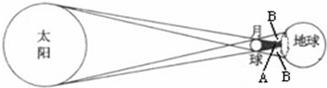 解答:日食形成的原因是光的直线传播原理,如图,在地球上A区域,太阳射向地球的光全部被月球挡住,人们看到的是日全食.在地球上B区域,太阳射向地球的光被月球挡住了一部分,所以,人们看到的是日偏食.