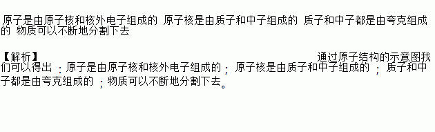 原子是由原子核和核外电子组成的 原子核是由质子和中子组成的 质子和中子都是由夸克组成的 物质可以不断地分割下去 【解析】通过原子结构的示意图我们可以得出 :原子是由原子核和核外电子组成的; 原子核是由质子和中子组成的 ; 质子和中子都是由夸克组成的 ;物质可以不断地分割下去。