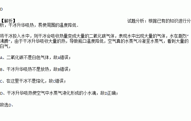 将干冰投入装水的玻璃瓶中时,发现水在剧烈“沸腾”,瓶口出现大量“白气”,此“白气”是( )