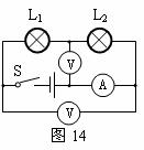 在图14中的圆圈内填入符号“A”或“V”,使两灯串联。(每表1分,共3分)