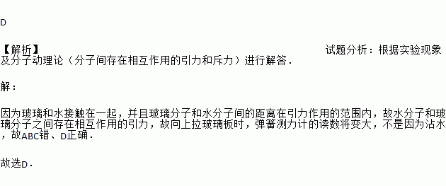 D ¡¾½âÎö¡¿ÊÔÌâ·ÖÎö£º¸ù¾ÝʵÑéÏÖÏó¼°·Ö×Ó¶¯ÀíÂÛ£¨·Ö×Ӽ䴿ÔÚÏ໥×÷ÓõÄÒýÁ¦ºÍ³âÁ¦£©½øÐнâ´ð£® ¡¾½âÎö¡¿ ÒòΪ²£Á§ºÍË®½Ó´¥ÔÚÒ»Æð£¬²¢ÇÒ²£Á§·Ö×ÓºÍË®·Ö×Ó¼äµÄ¾àÀëÔÚÒýÁ¦×÷Óõķ¶Î§ÄÚ£¬¹ÊË®·Ö×ӺͲ£Á§·Ö×ÓÖ®¼ä´æÔÚÏ໥×÷ÓõÄÒýÁ¦£¬¹ÊÏòÉÏÀ²£Á§°åʱ£¬µ¯»É²âÁ¦¼ÆµÄ¶ÁÊý½«±ä´ó£¬²»ÊÇÒòΪմˮ£¬¹ÊABC´í¡¢DÕýÈ·£® ¹ÊÑ¡D£®